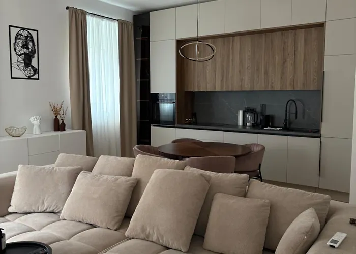 Central Nude Oasis apartment includes a living room and a fully equipped kitchen with climate control for utmost comfort.